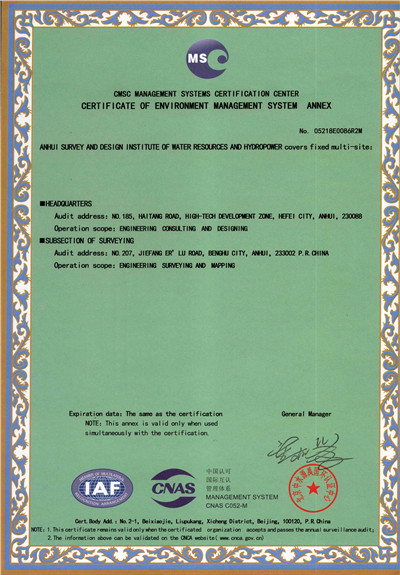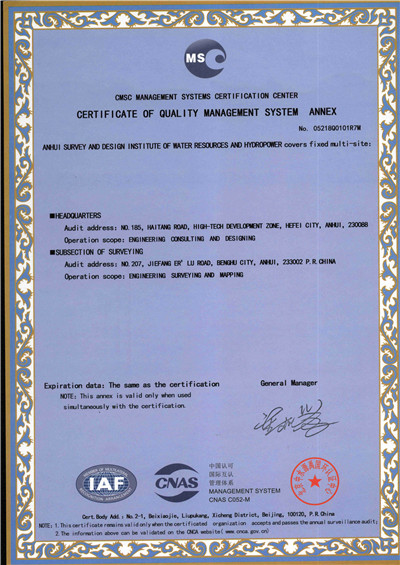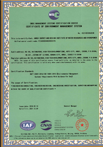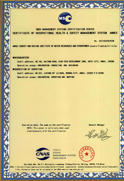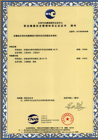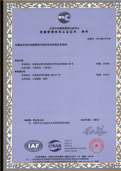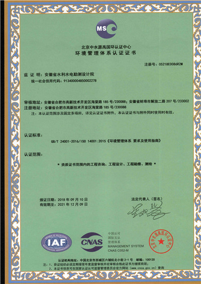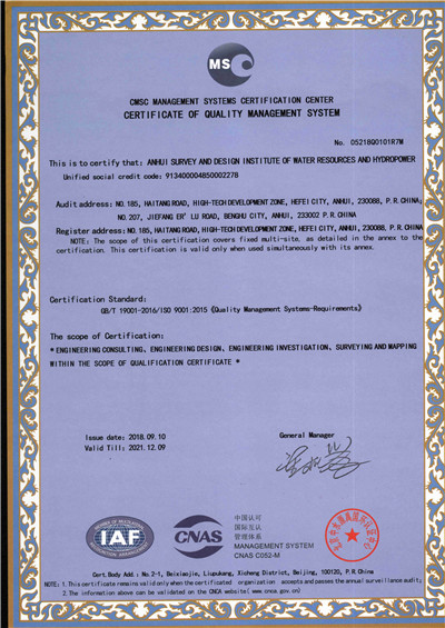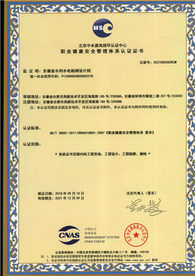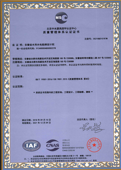 安徽省水利水電勘測(cè)設(shè)計(jì)院(簡稱ASDI)于1996年開始貫徹ISO9000族標(biāo)準(zhǔn),進(jìn)行質(zhì)量認(rèn)證工作,1997年12月首次通過ISO9001質(zhì)量體系認(rèn)證,期間經(jīng)歷了ISO9001:1994、ISO9001:2000、ISO9001:2008標(biāo)準(zhǔn)認(rèn)證,建立了符合ISO9001標(biāo)準(zhǔn)的質(zhì)量管理體系。2012年通過GB/T19001-2008、GB/T24001-2004、GB/T28001-2011的“質(zhì)量/環(huán)境/職業(yè)健康安全”三標(biāo)一體化認(rèn)證,2018年通過GB/T19001-2016、GB/T24001-2016和GB/T28001-2011“質(zhì)量/環(huán)境/職業(yè)健康安全”三標(biāo)一體化換版認(rèn)證。